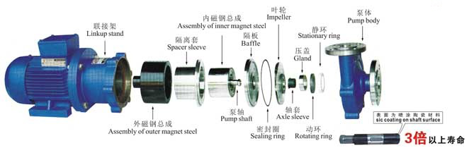 磁力泵結構緊湊,外形美觀,體積小,噪音低,運行可靠,使用維修方便??蓮V泛用于化工、制藥、石油、電鍍、食 品、國防、科研機構、冶金、染料等單位抽送酸、堿液、油類稀有貴重液、毒液、揮發性液體,以及循環水設備 配套、過濾機配套。特別是易漏、易,燃、易爆液體的抽送。防爆電動機選用此泵則更為理想設備。