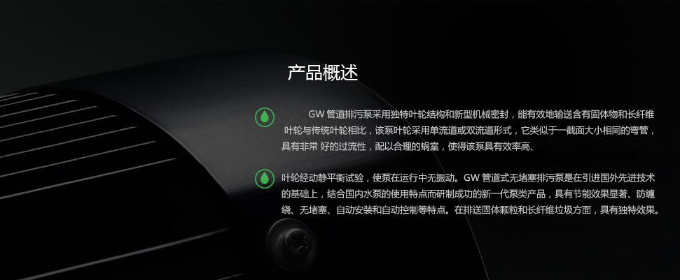 GW管道排污水泵是在引進國外先進技術的基礎上,結合國內水泵的使用特點而研制成功的新一代泵類產品,具有節(jié)能效果顯著、防纏繞、無堵塞、自動安裝和自動控制等特點。在排送固體顆粒和長纖維垃圾方面,具有獨特效果
